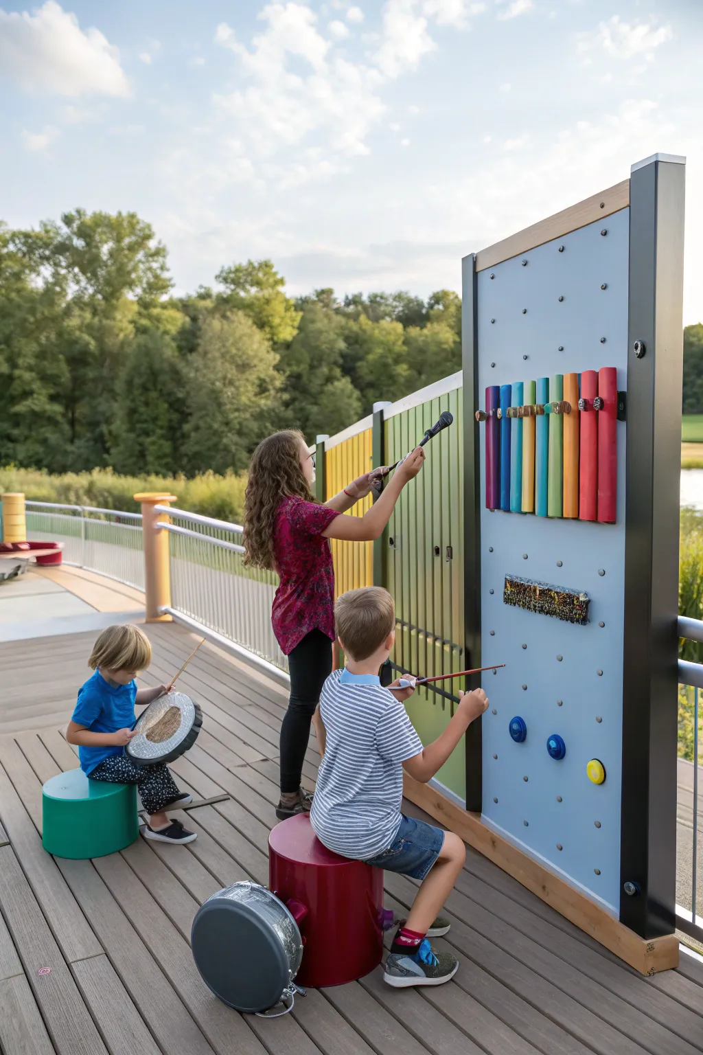 Kids are playing a variety of instruments on a deck with an interactive music wall.