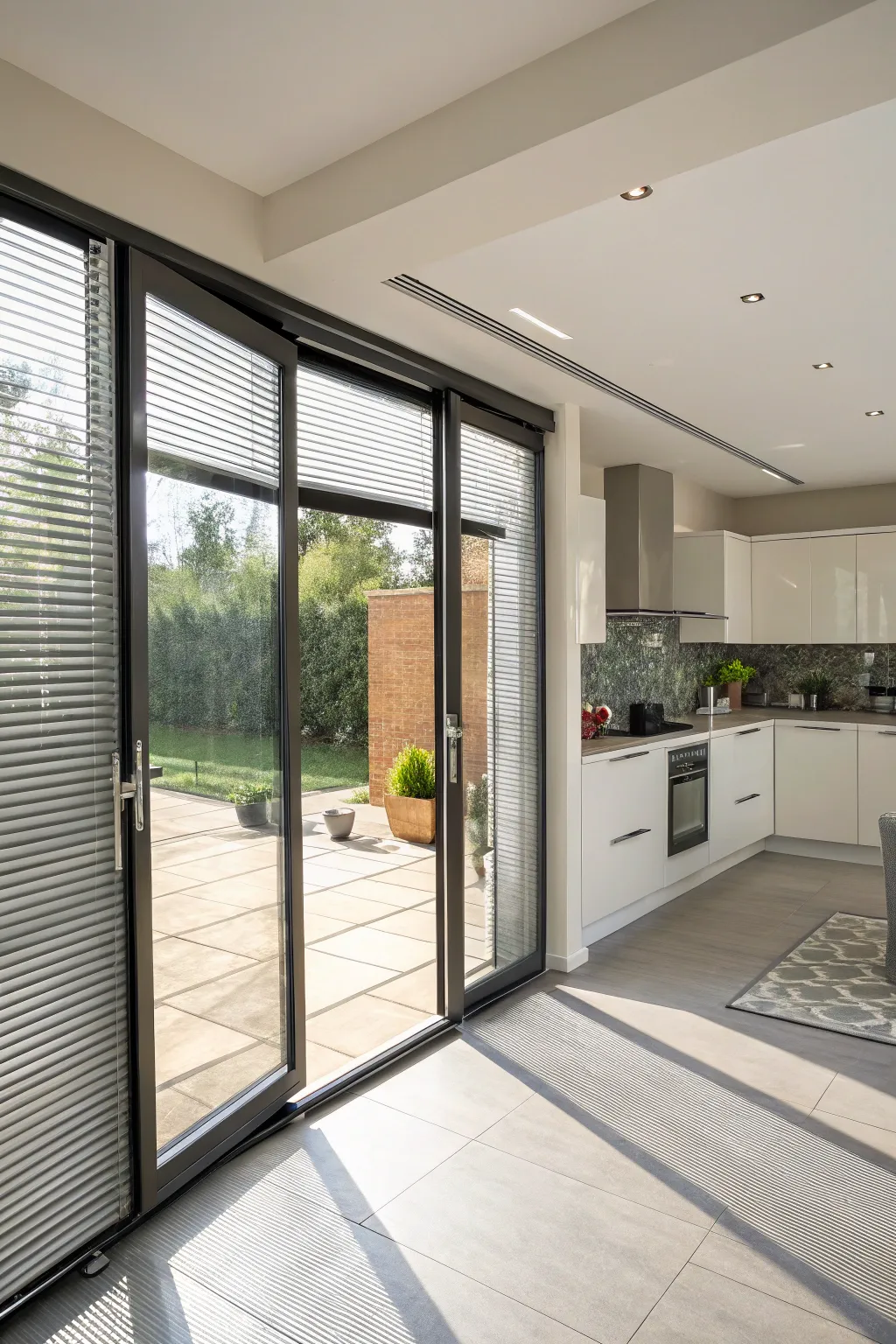 Built-in shades within the glass sections offer flexible light management. This feature is a favorite in my designs, providing both practicality and a sleek appearance.