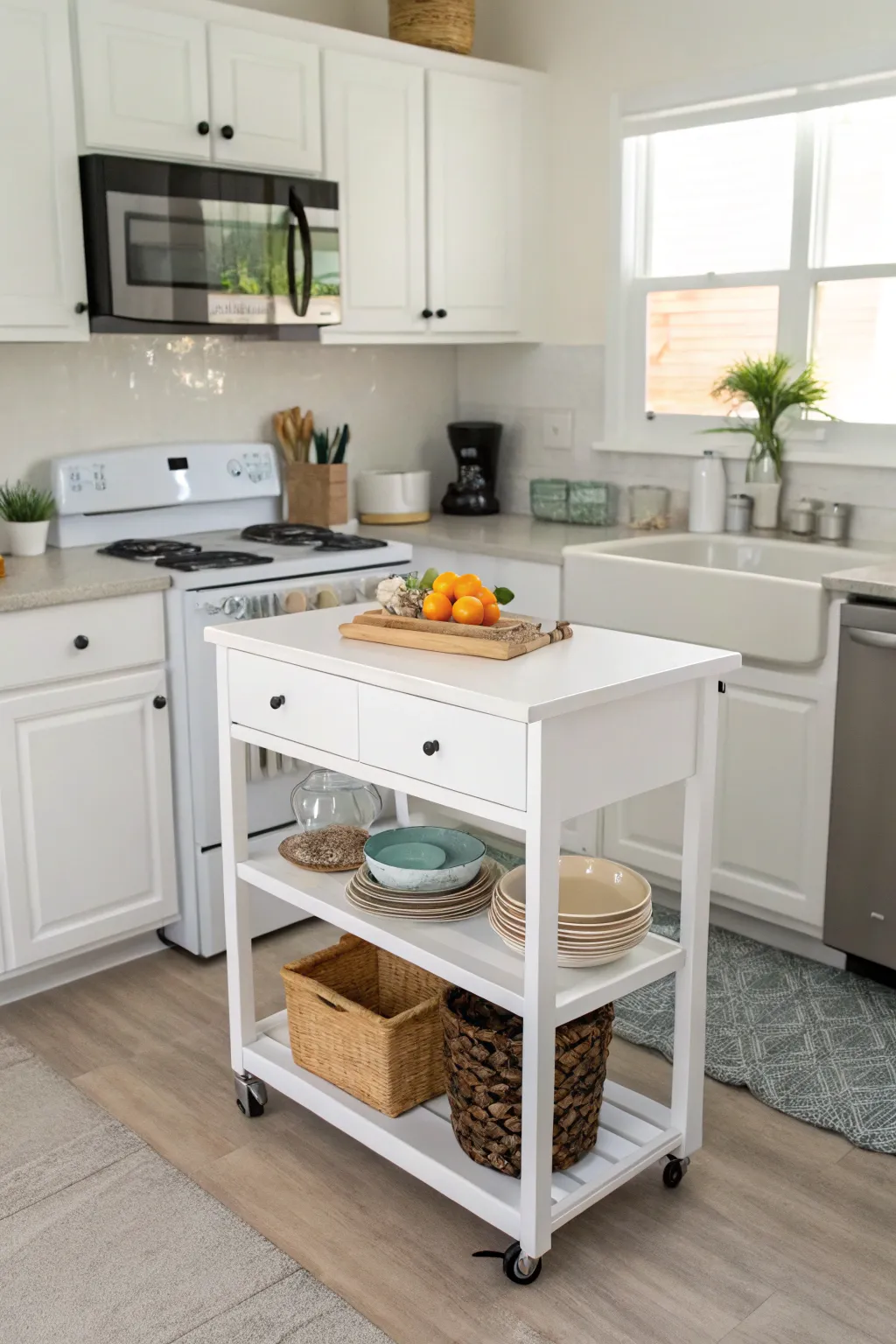 - Mobile White Utility Trolley: Enhance your kitchen’s functionality with this sleek rolling cart, providing additional workspace and storage.