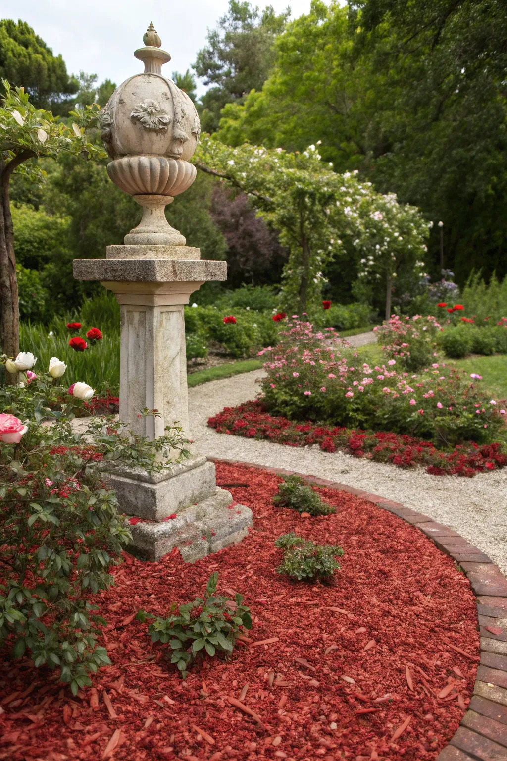 Enclose garden art with scarlet ground cover to make them focal points. It’s a straightforward trick that adds elegance and focus.