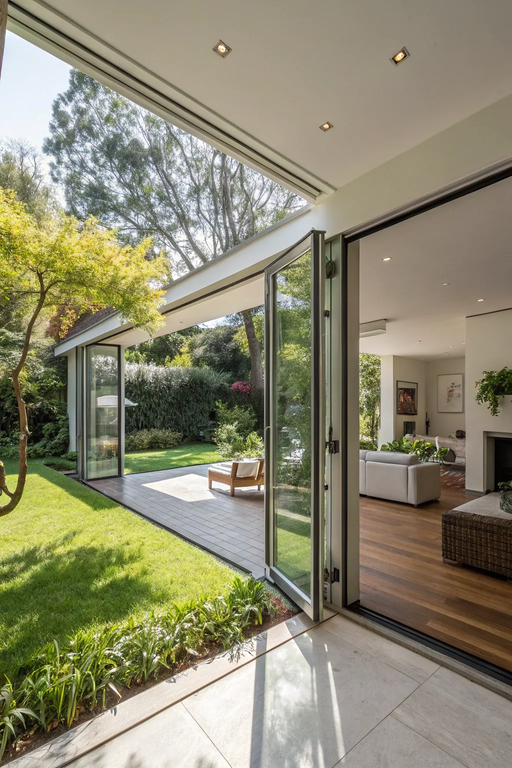 The epitome of indoor-outdoor living is folding glass walls, which effortlessly combine your living area with nature. I find them ideal for opening up a house to a garden or patio.