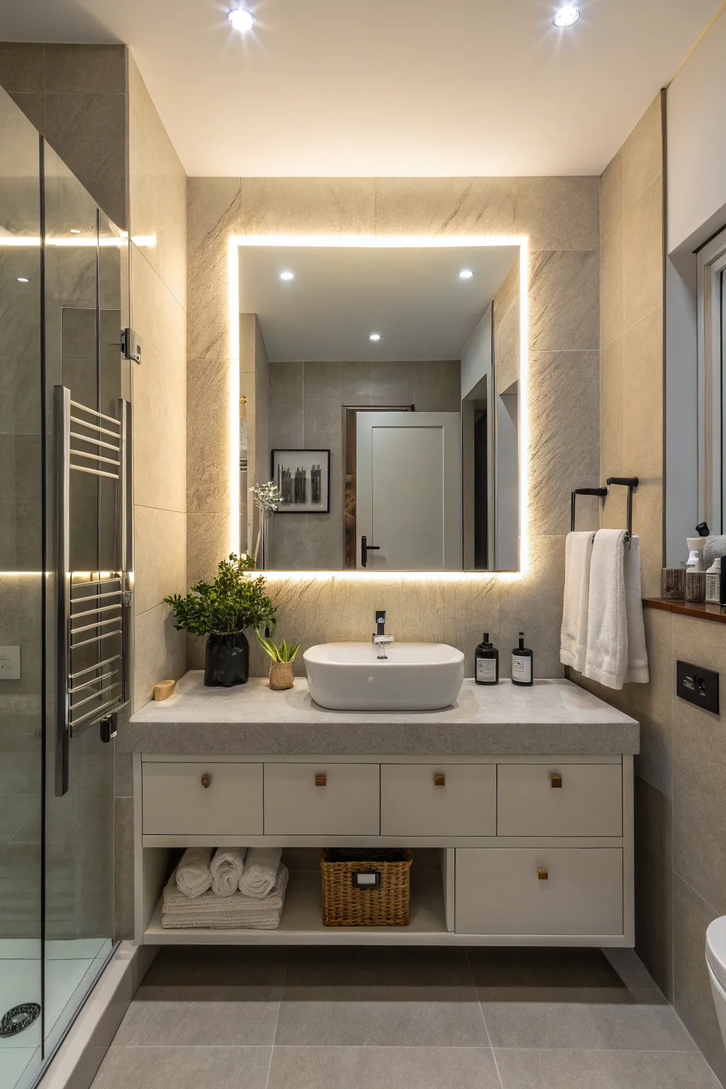 A backlit mirror introduces a gentle, surrounding light that transforms any bathroom into a peaceful escape. I’ve personally observed how this setup can accentuate a room’s best qualities while delivering optimal lighting for intricate tasks.