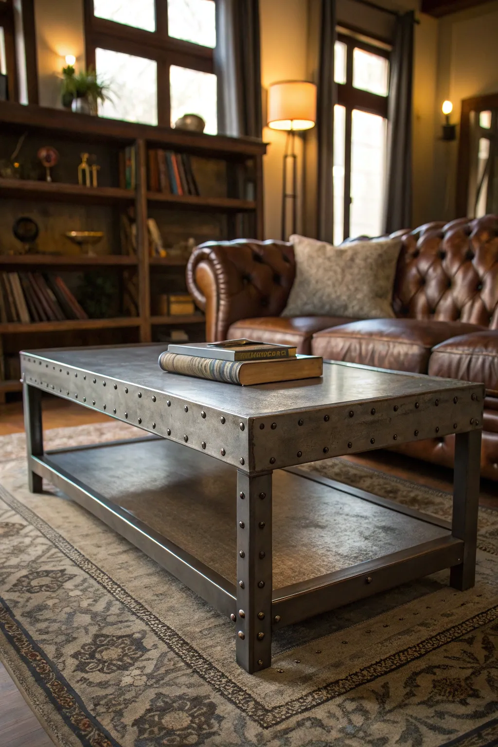 • Rivet Style Bookshelf: Complete your industrial aesthetic with a rivet-style bookshelf that’s both useful and prominent.