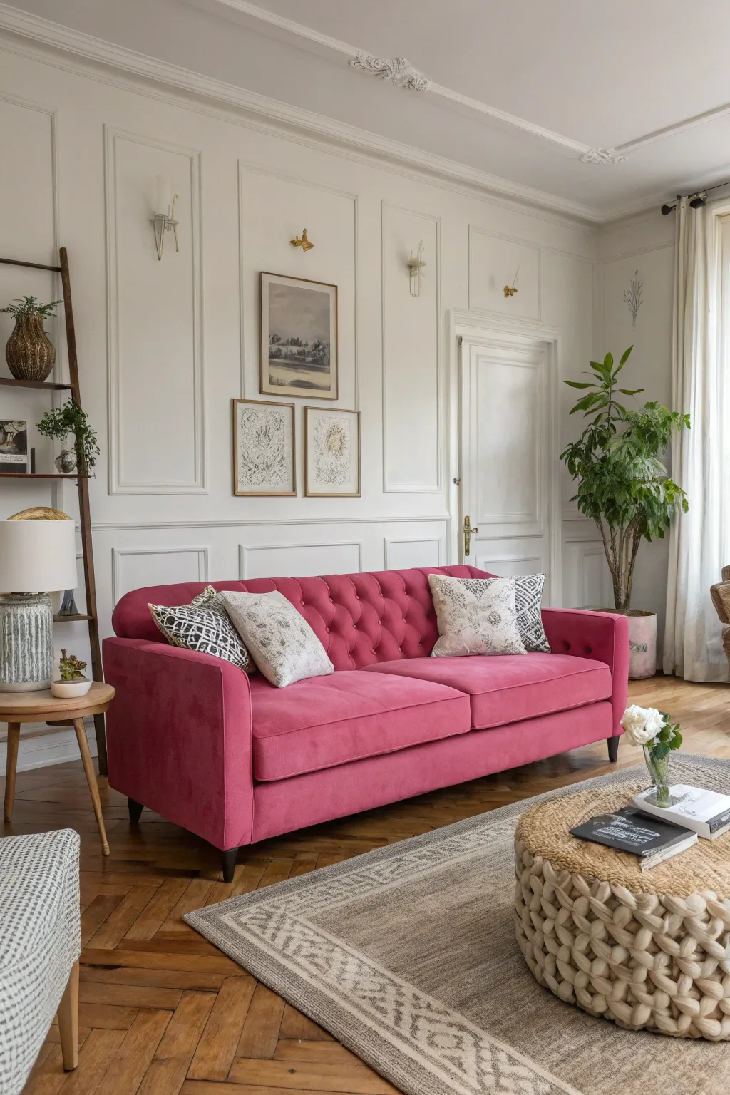 - Contemporary Pale Cushions: Counterbalance the daring roseate sofa with stylish, pale cushions to round off the design.