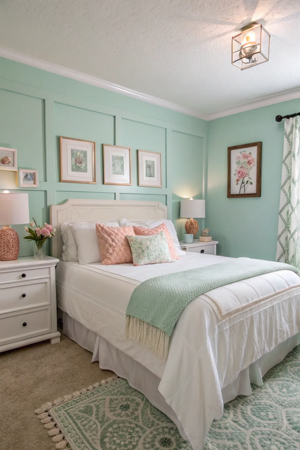 Go with a mint green headboard to make a bold statement. This point of interest can anchor the space and highlight the color scheme beautifully.