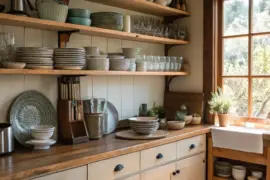 - Glass Storage Containers with Bamboo Covers: Organize beautifully with glass storage containers, adding practicality and elegance to cooking space shelves.