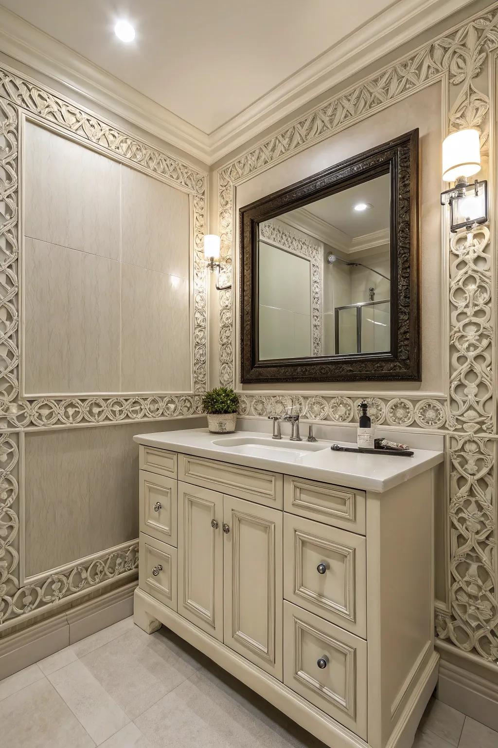 Adorn your bathroom reflections with ornamental edging to append a glimmer of refinement. This straightforward enhancement can transmute your reflection into an awe-inspiring focal element.
