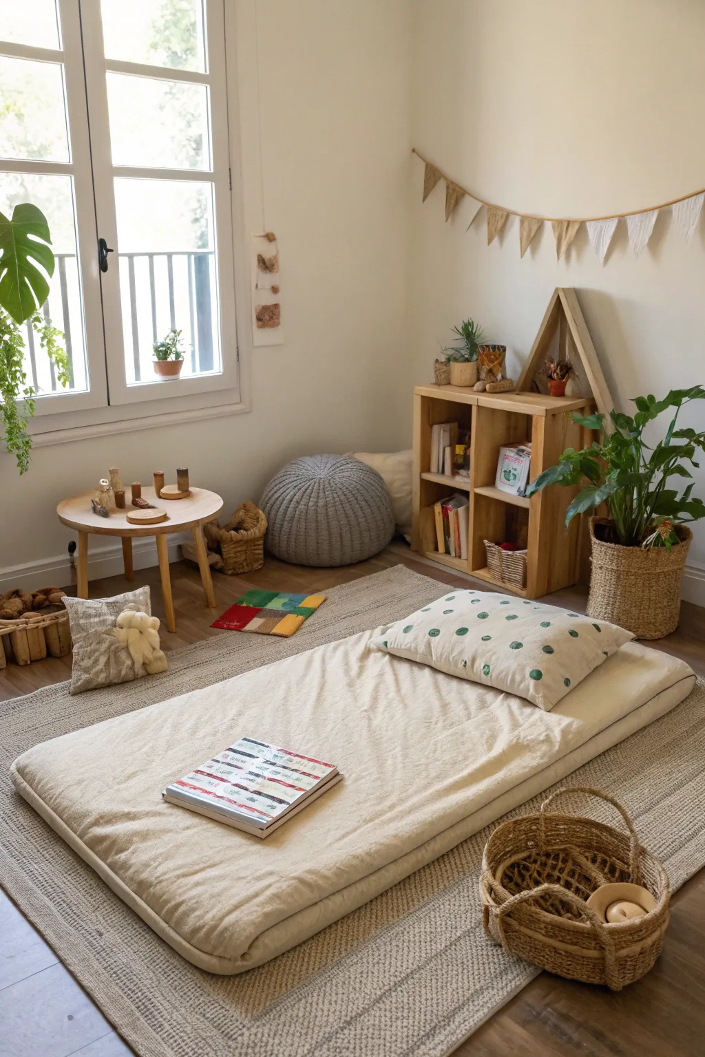 A ground-level bed is essential in Montessori-style rooms, giving children the liberty to climb in and out as they wish. I’ve witnessed how this straightforward adjustment can build independence and ensure a restful night.