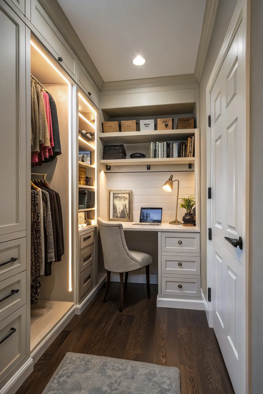 For a multifunctional area, consider a built-in desk at your closet’s end. I’ve noticed this produce a comfortable, productive nook that optimizes every inch.