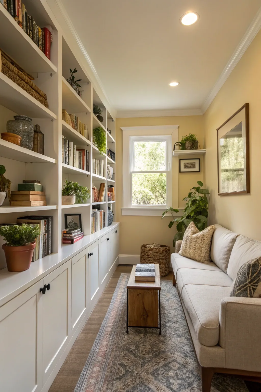 When dealing with slender living spaces, make use of the walls. In my own experience, incorporating high shelving units or vertical storage solutions creates open floor space while naturally guiding the gaze upwards, imbuing the area with a sense of amplified height.
