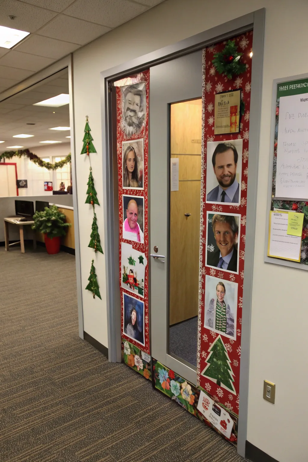 Revamp your door with playful elves caught in the act, wrapping office staples as presents. I once witnessed a door adorned with elves using adhesive notes as ornaments, and it was a total triumph!