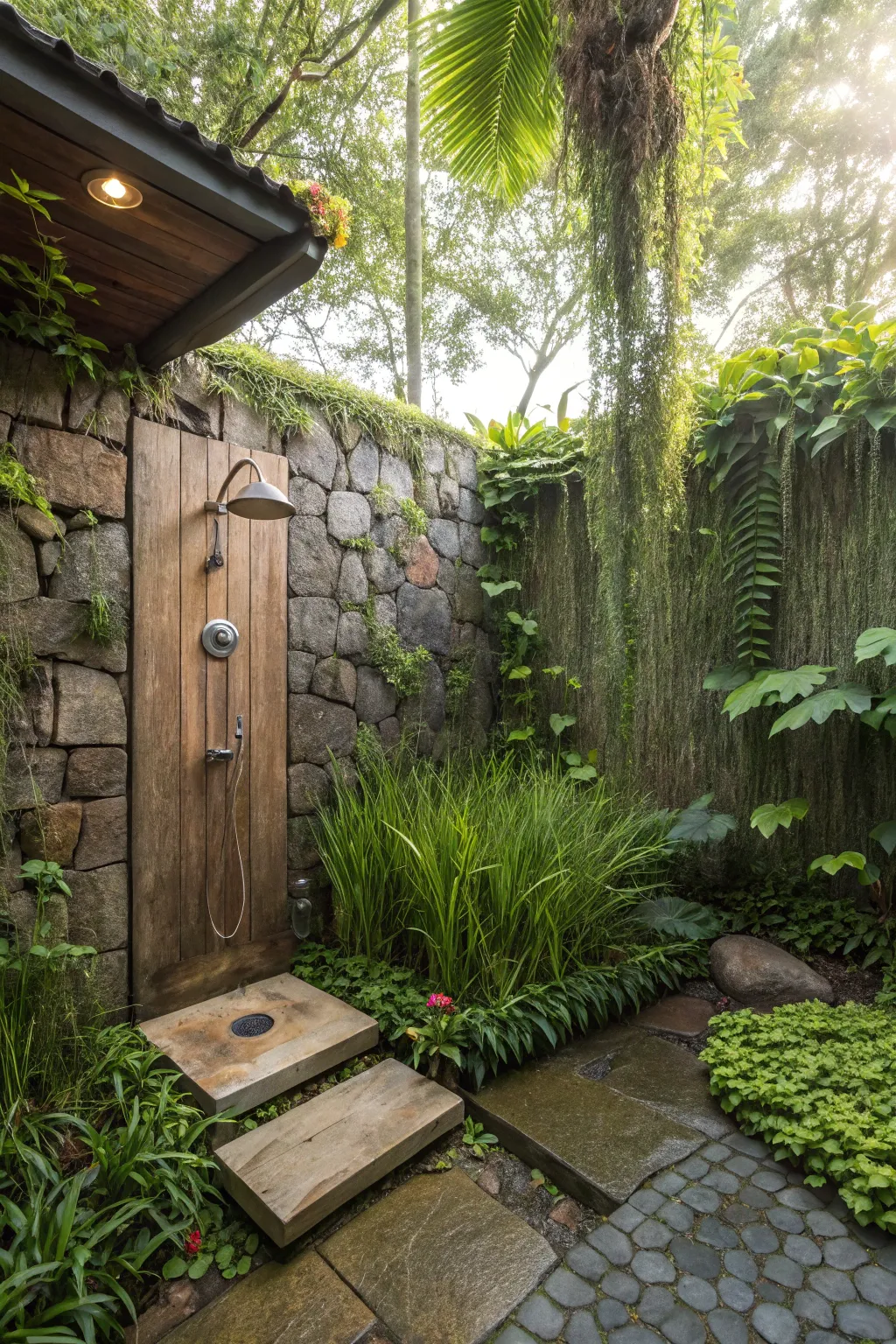 - Garden Privacy Screen: Incorporate style and peace to your open-air shower using a decorative garden screen. Take pleasure in the tranquility.