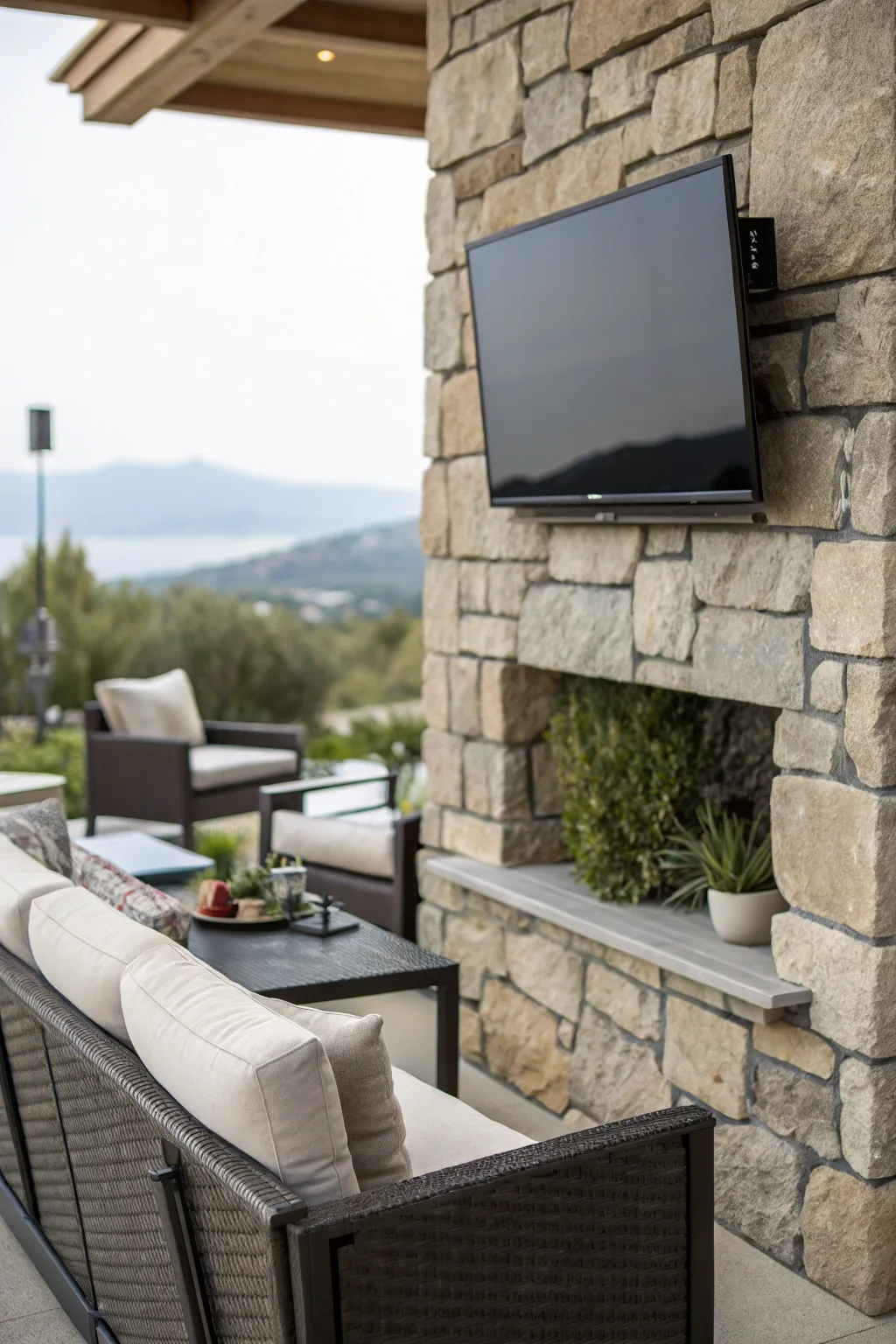Setting up your TV under a sheltered patio provides necessary protection from the elements. In my experience, integrating a pergola or awning does more than just protect; it crafts an inviting viewing retreat.