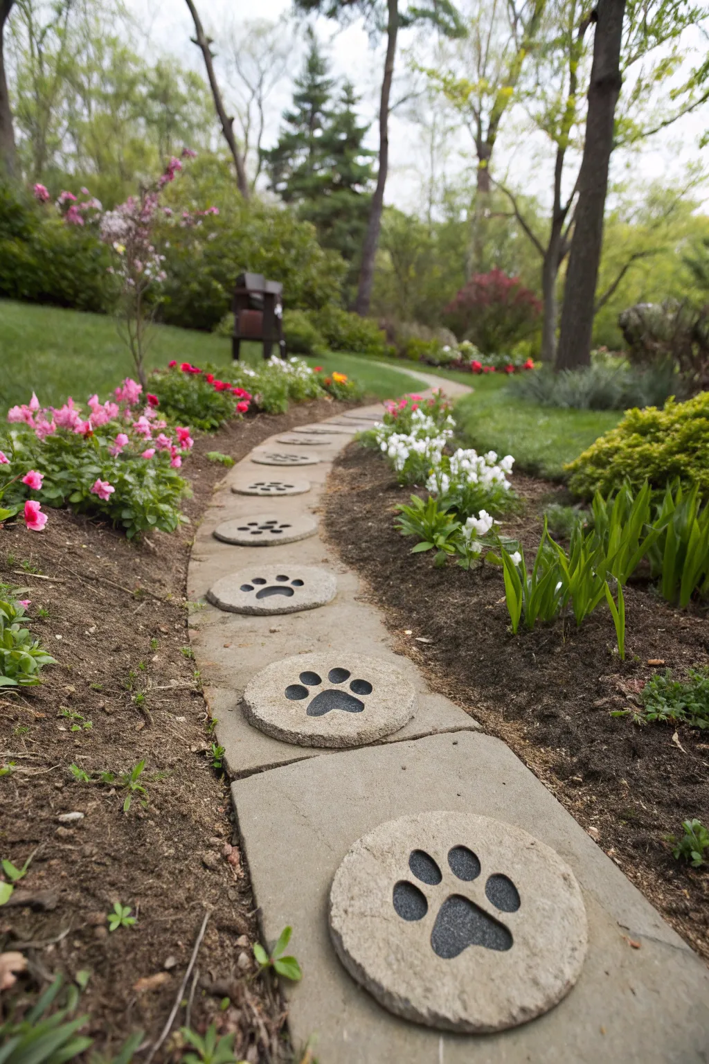 A personalized walkway paved with unique paw impression stones, nestled within a lush garden setting.