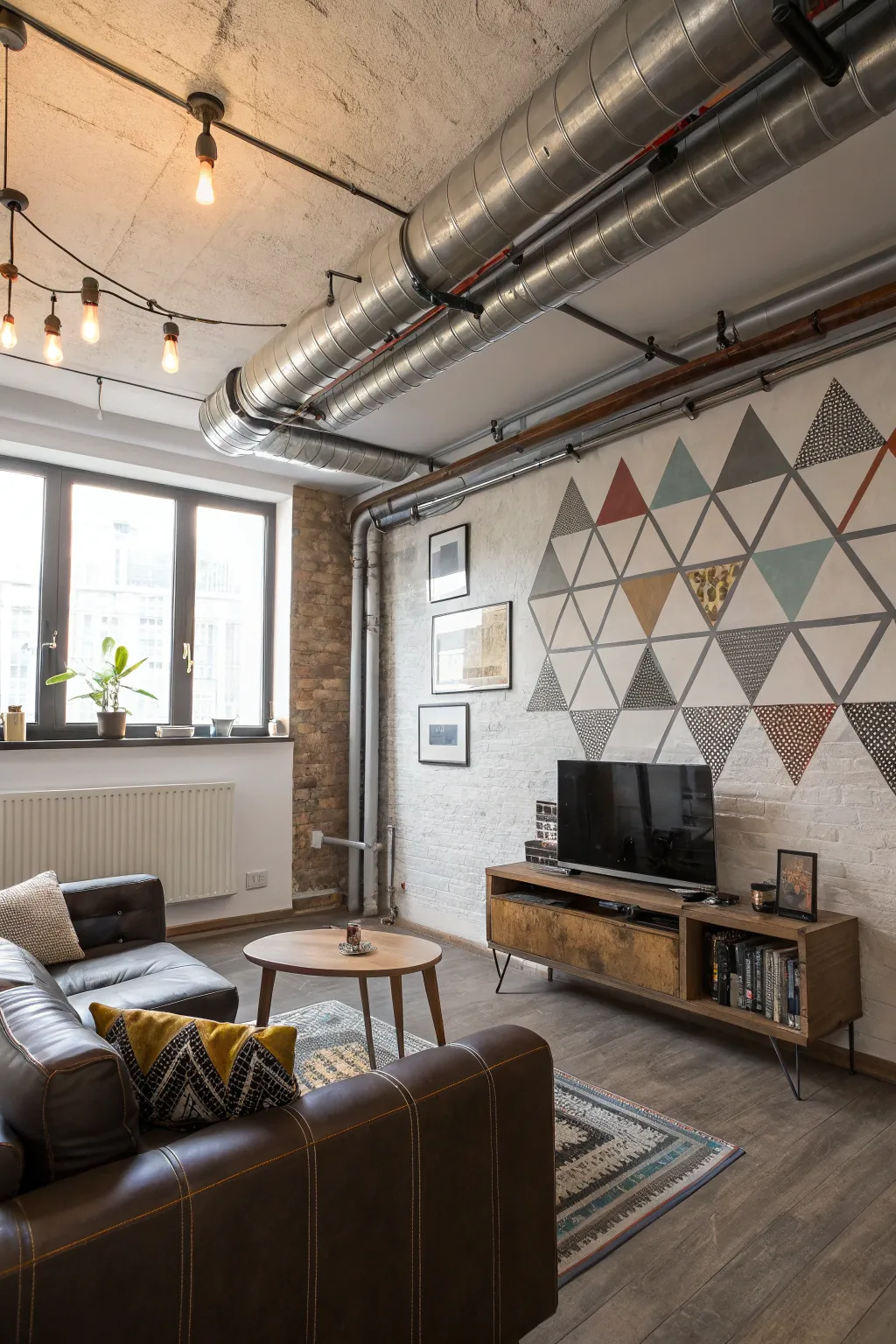 Transform pipes into artwork by adding imaginative elements such as angular designs. This inventive approach turns an eyesore into something worth talking about.