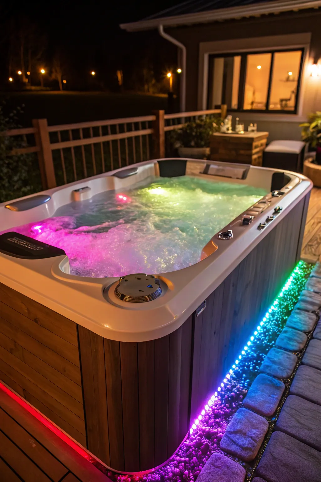 Think about using colored LED lights in the hot tub to create a dynamic and vibrant atmosphere. I’m fascinated by the way the colors change and reflect off the water, adding extra visual interest.