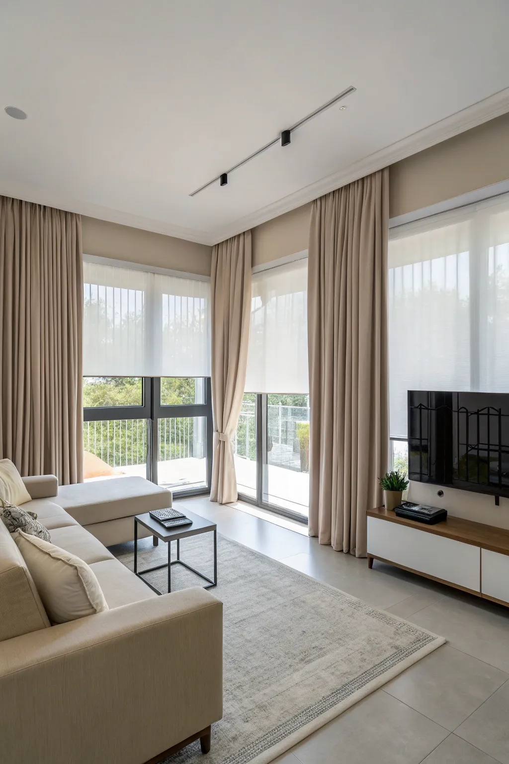 Mix smart shades with your curtains for simplicity and a modern vibe. I’m fond of how this arrangement enables me to handle light with just an easy voice command or an app.