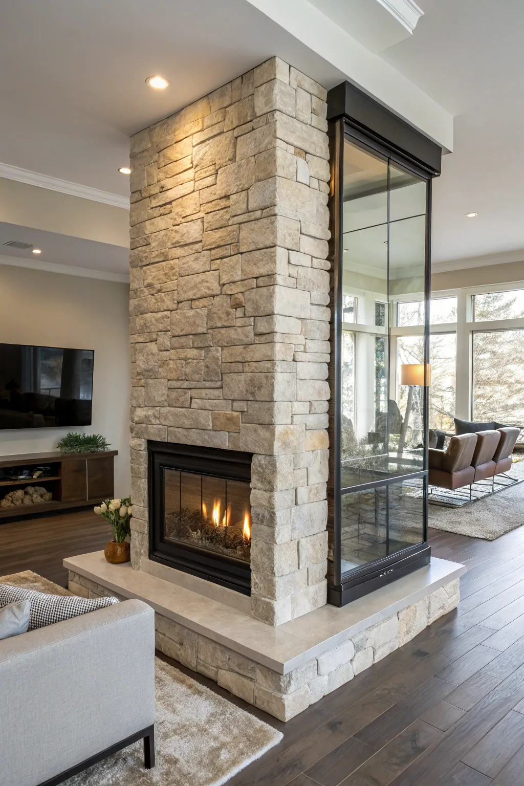 Pairing stone with glass in a fireplace that acts as a room divider results in a striking yet sophisticated look. I particularly appreciate this mix, as it combines a rustic feel with modern elegance.