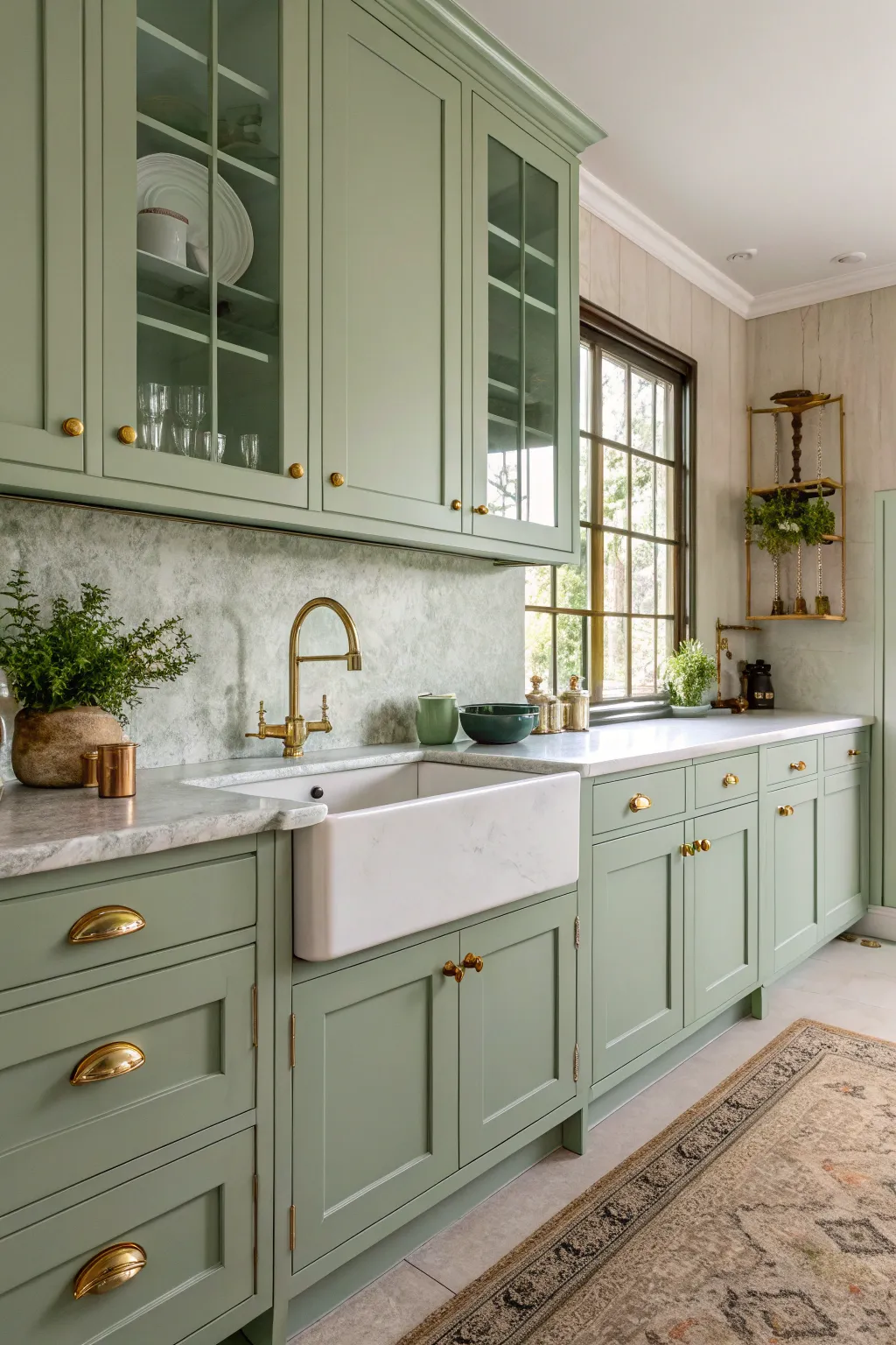 Soft, muted sage green has an incredible ability to lift the ambiance of any kitchen. Allow us to delve into some delightful concepts for weaving this tranquil shade into your kitchen’s overall aesthetic.