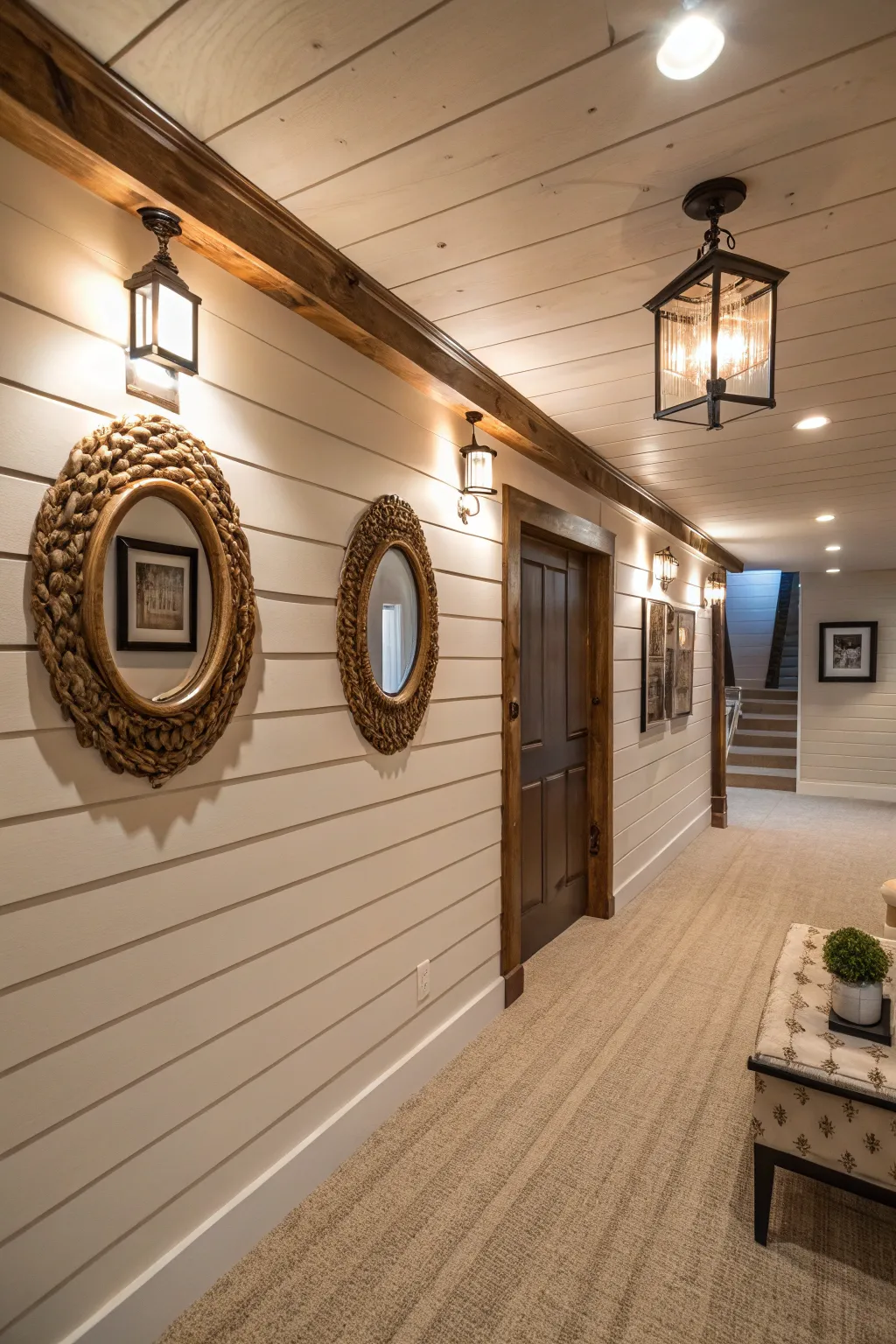 Enhance natural light by combining shiplap with strategically positioned mirrors. This technique brightens the basement and creates a feeling of spaciousness.