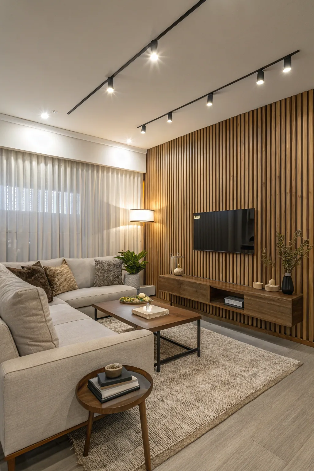 Channel a mid-century modern vibe with darker wood tones. I used walnut slats in my living room, and it adds a rich, sophisticated feel.