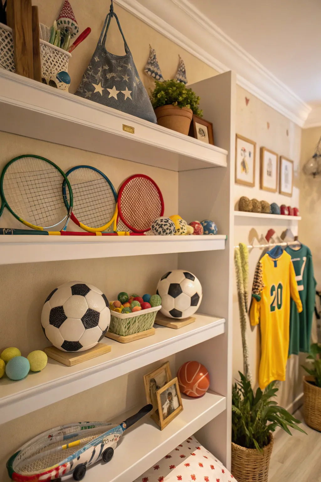 - Sports-Themed Organizer Rack: Make organizing fun with a sports-themed shelf, ideal for any sporty nursery.