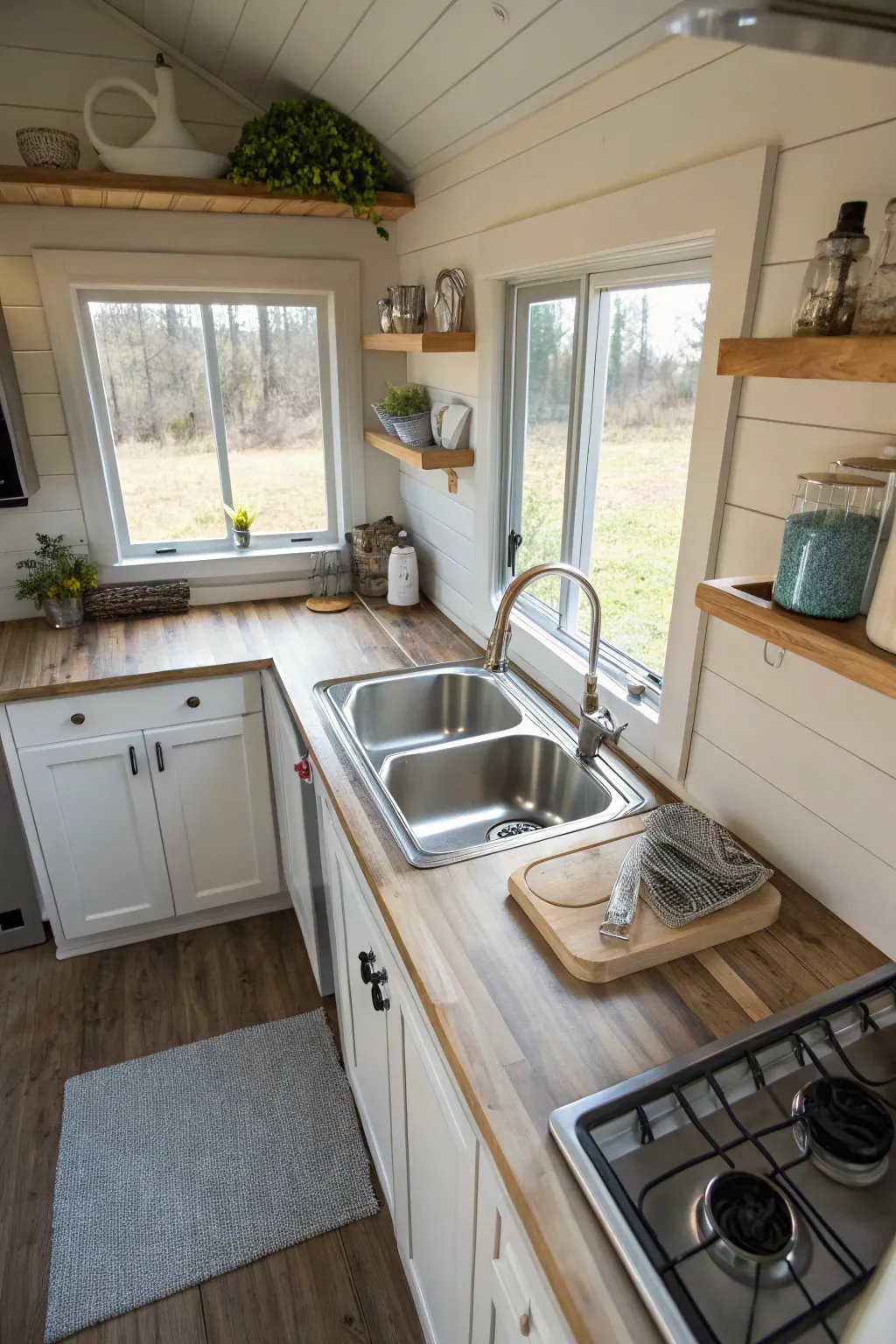 A stainless steel sink adding durability and style to a compact house kitchen.