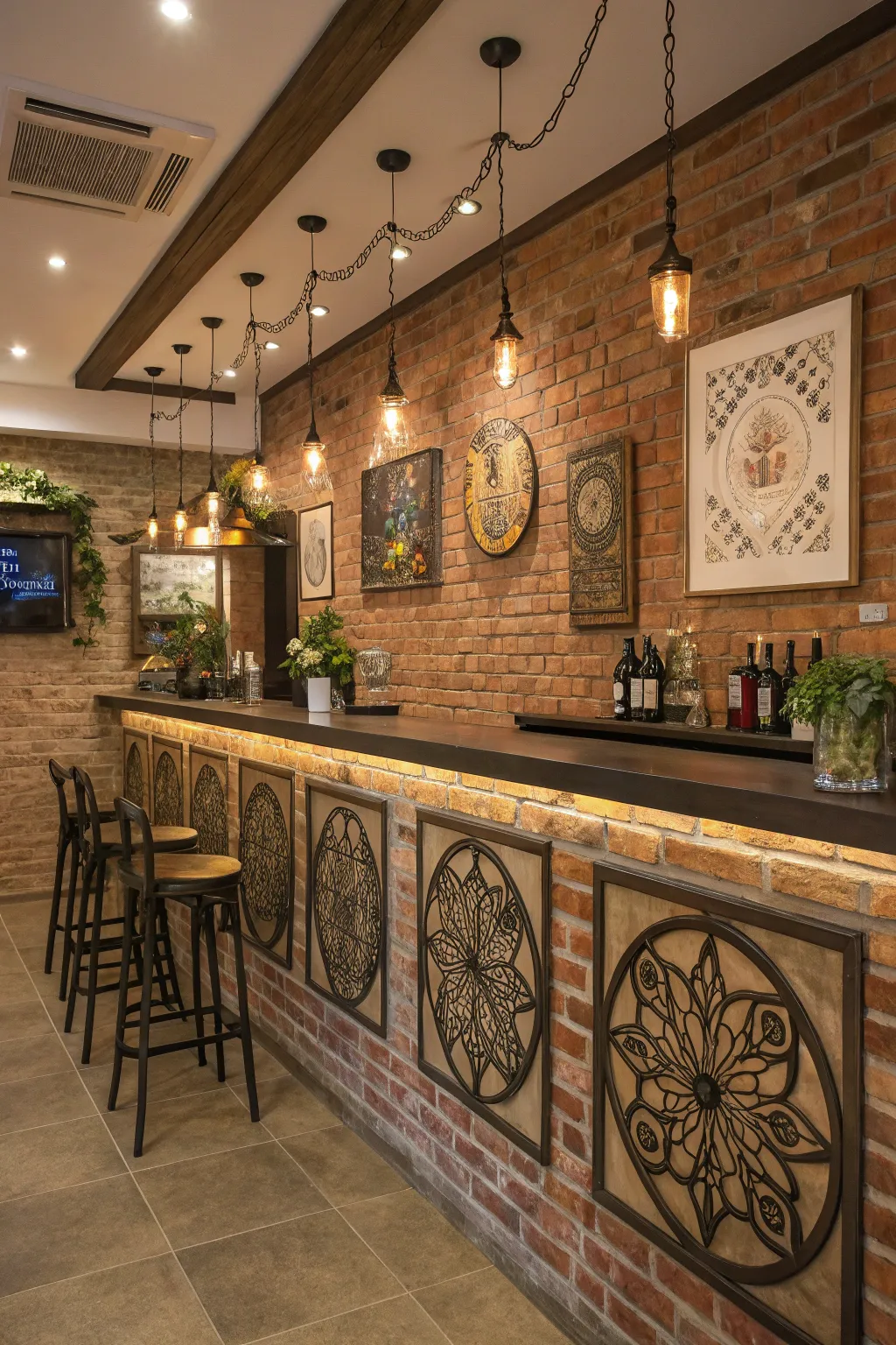 Personalize your bar space with customized wall decor that showcases your unique taste. Drawing from my own experiences, I’ve found that distinctive pieces can transform an ordinary brick wall into a captivating point of interest.
