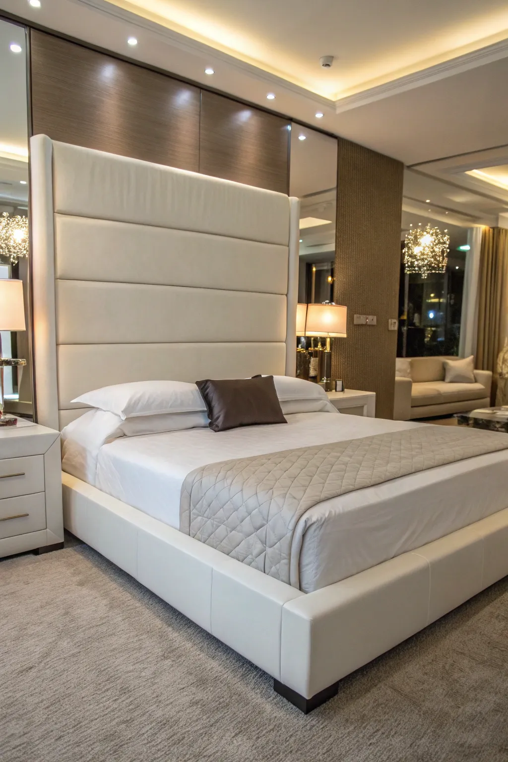 Introduce a hint of elegance with a mirrored bed frame, which has the ability to make your space seem more expansive and airy. I often use this technique in smaller rooms that could use a bit of shimmer.