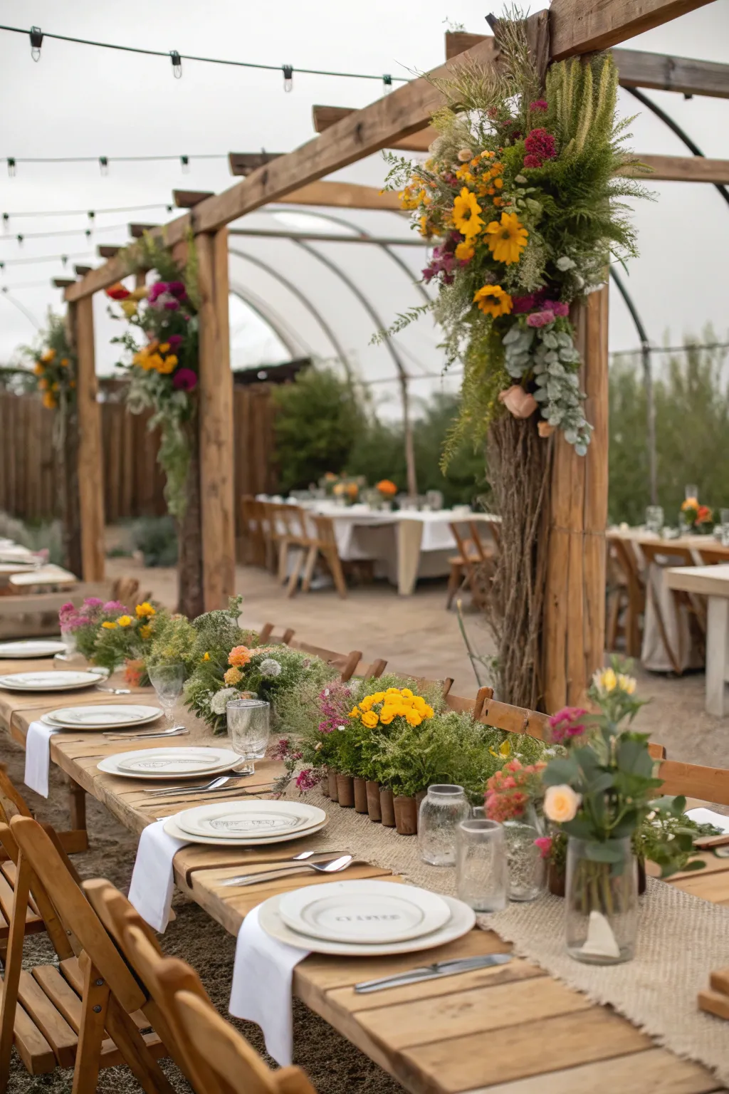 - Natural Timber Entrance: Craft a stunning centerpiece with a natural timber entrance adorned with flowers and greenery.