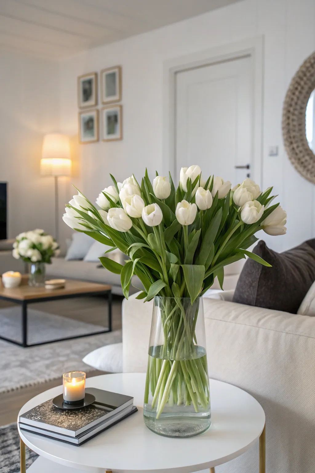 For a revitalized atmosphere, set up white tulips in front of an alabaster wall or backdrop. The minimalist nature of this setup consistently infuses my lounge with a serene vibe.