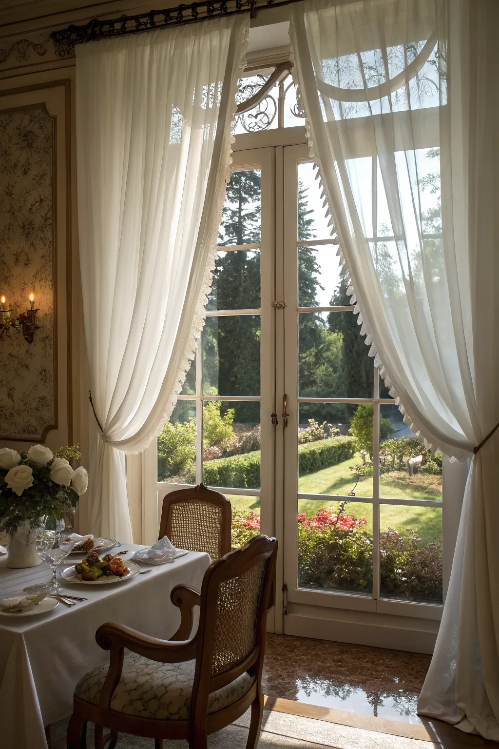 Sheer curtains bring a light, airy ambiance to a small dining room.