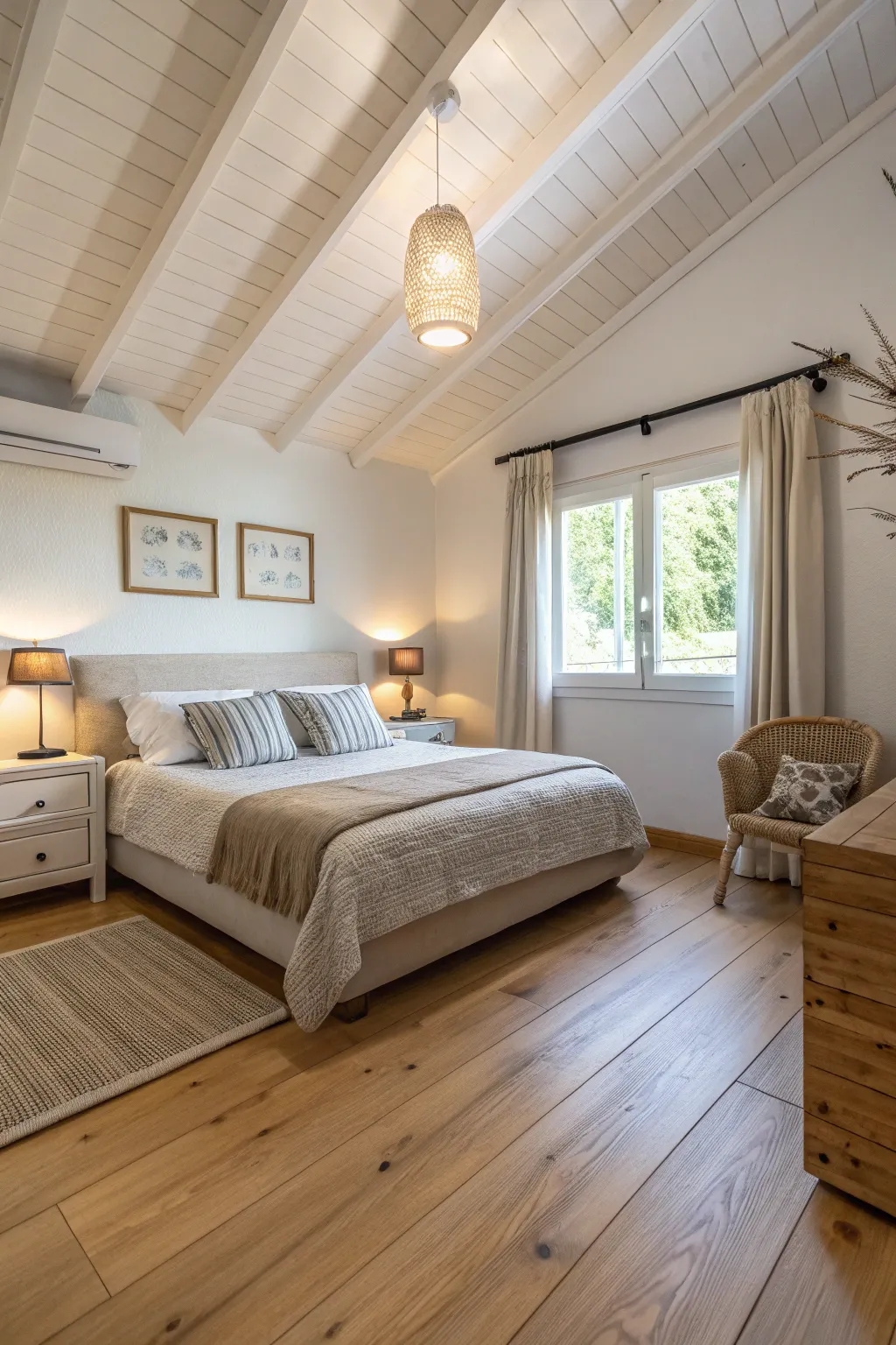 Layering fabrics such as a plush floor covering or woven throw across your timber flooring brings a cozy warmth to the bedroom. I often suggest this to incorporate depth and coziness without excess.